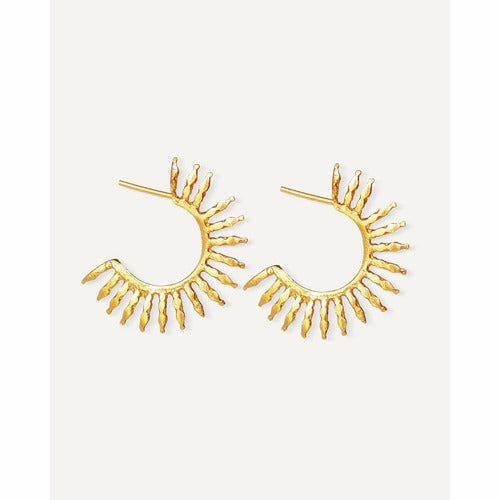 Reminding us of a petite sun, these small gold hoops have an eye-catching design. Handmade from 21 ct gold plated brass, these boho earrings have been finished with a chic hand-hammered texture. Wear these sun earrings to brighten up any look.